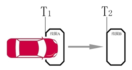 為在高清智能卡口管理系統中,在每條需要監測的車道上沿行車方向埋設兩個線圈,線圈之間的間距是固定的,對于經過的車輛,可以取得四個時刻,分別是車輛進入兩個線圈和離開兩個線圈的時刻。計算車輛通過兩線圈所需的時間,配合兩線圈的間距,即可求得平均車速,如圖所示。