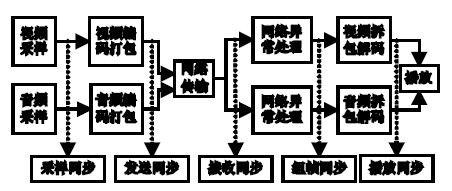 本方法基本思路是:在音視頻數據的采樣、編碼、打包、發送、網絡傳輸、接收、網絡異常處理、拆包、解碼、播放這十個處理過程中,采集、編碼、打包、拆包和解碼的時間基本上固定,不會因為網絡環境差異造成時延的差異,而發送、網絡傳輸、接收、網絡異常處理四個過程則具有較大的隨機性,其處理時間會隨著網絡性能的不同有較大的差異,進而造成播放時音視頻的不同步。因此唇音同步處理的重點就在于保證發送、網絡傳輸、接收、網絡異常處理這四個過程中音視頻的同步,即圖1 中發送同步到組幀同步之間的部分。