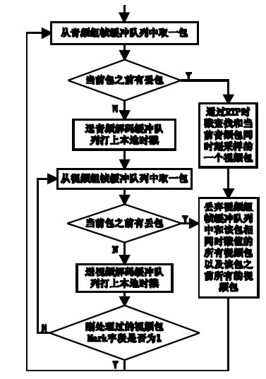 H.323 視頻會議中,與會各方的編解碼協議、采樣率、幀率等參數在打開通道后的能力協商階段即已確定,要改變這些參數,必然要重新能力協商,而任何時候應用層都知道協商的結果。所以只要規定一個會話中發送的頭一個音頻包和頭一個視頻包的時戳相同,即可由時戳來建立音視頻包的對應關系。實際上,視頻數據頭一幀的圖像分成多個包傳輸,這幾個包具有相同的時戳,同時丟失的可能性很小。而且視頻組幀解碼過程中,還要分I 幀、P 幀和B 幀區別處理,比如每個GOP 中只要I 幀丟失,其后的P 幀和B 幀都必須丟棄,直到收到下一個I 幀,這已經超出了本文的研究范圍,此處不再詳述。