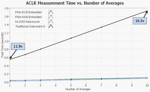 在圖9中你可以看到,對于一些測量來說,在達到相同的測量結果時,PXI RF儀器可以比傳統儀器快30倍。此外,在一些需要更多的平均次數的測量中,PXI儀器在絕對的測量時間上的優勢更為顯著。