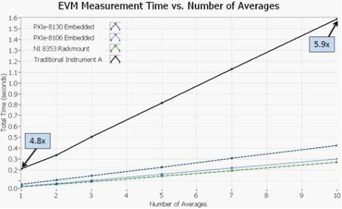 對于處理器密集型的物理層測量來說,選擇不同的處理器對總體的測量時間影響很大。在圖7至9中,可以看到傳統儀器和PXI儀器在測量時間和平均次數之間的關系。