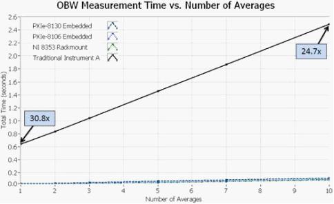 圖9. 在占用帶寬的測量中,使用PXI儀器可以比傳統儀器快30倍。