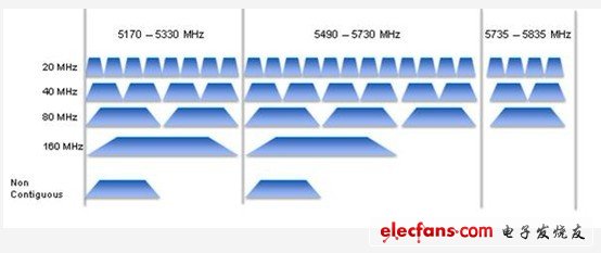 802.11ac可支持5 GHz波段并強制包括20、40和80 MHz帶寬。支持160 MHz當前為可選項。可選項還包括非連續80+80 MHz TX和RX帶寬。