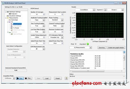 NI WLAN分析工具包提供的軟面板可通過NI PXIe-5644R使用快速生成或采集功能。該分析軟面板可用于調制或頻譜測量。通過軟面板和多達4臺NI PXIe-5644R也可獲得4x4 MIMO配置。