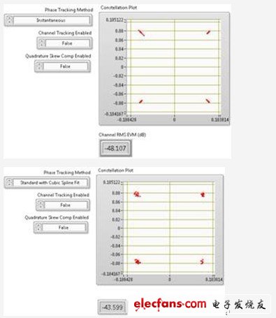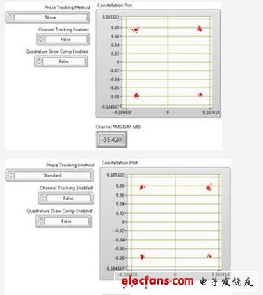 圖9. 上圖顯示了80 MHz 802.11ac信號進行相位跟蹤對EVM數的影響。該圖表在256-QAM信號圖中僅顯示了4個符號。
