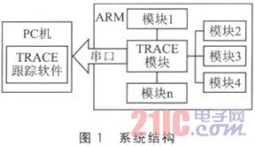 當其他模塊有跟蹤信息打印時,其他模塊調用TRACE模塊提供的打印函數。TRACE模塊接收到打印信息后,通過設置打印參數來判斷是否需要把這些打印信息發送到PC機。如果需要,則通過UART串口將打印信息傳送到PC機的TRACE跟蹤軟件,TRACE模塊對其進行解碼之后,通過解碼軟件顯示出來。