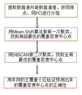 以基站采集到的終端測量報告作為數(shù)據(jù)源,并將數(shù)據(jù)源按頻點(diǎn)和PCI(Physical Cell Identifier,物理小區(qū)標(biāo)識)進(jìn)行分組,對分組后的每組數(shù)據(jù)用Mean-Shift(偏移均值向量算法)算法做首次密度聚類[3-4],找到局部最優(yōu)的基站覆蓋中心點(diǎn)。結(jié)合專業(yè)的業(yè)務(wù)背景知識,對局部基站覆蓋中心點(diǎn)用DBSCAN算法做二次聚類,找到全局最優(yōu)的基站覆蓋中心點(diǎn)[5-8]。最后用本網(wǎng)的主覆蓋小區(qū)來驗證所預(yù)測出來的基站覆蓋中心點(diǎn)的正確性。具體流程如圖1所示: