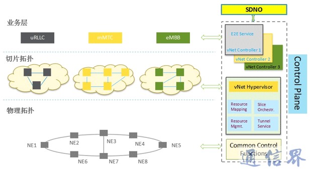 圖1中的切片控制器vNet Hypervisor,是實現網絡切片的一種特殊的SDN Controller,負責vNet虛擬資源到物理資源的映射、vNet創建管理。業務層的控制器vNet Controller是vNet資源的使用者,只能看到分配給自己的vNet資源,可以在自己的vNet上創建各種業務(如L2VPN、L3VPN),并負責業務生命周期控制。每個vNet對應一個獨立的vNet Controller,支持vNet間控制面和管理面的隔離。Common Control Function是通用SDN控制器的主要組件,當不需要網絡虛擬化時,此組件可直接控制物理網絡。而SDNO負責 vNet Hypervisor上的切片編排策略、vNet的生命周期控制。