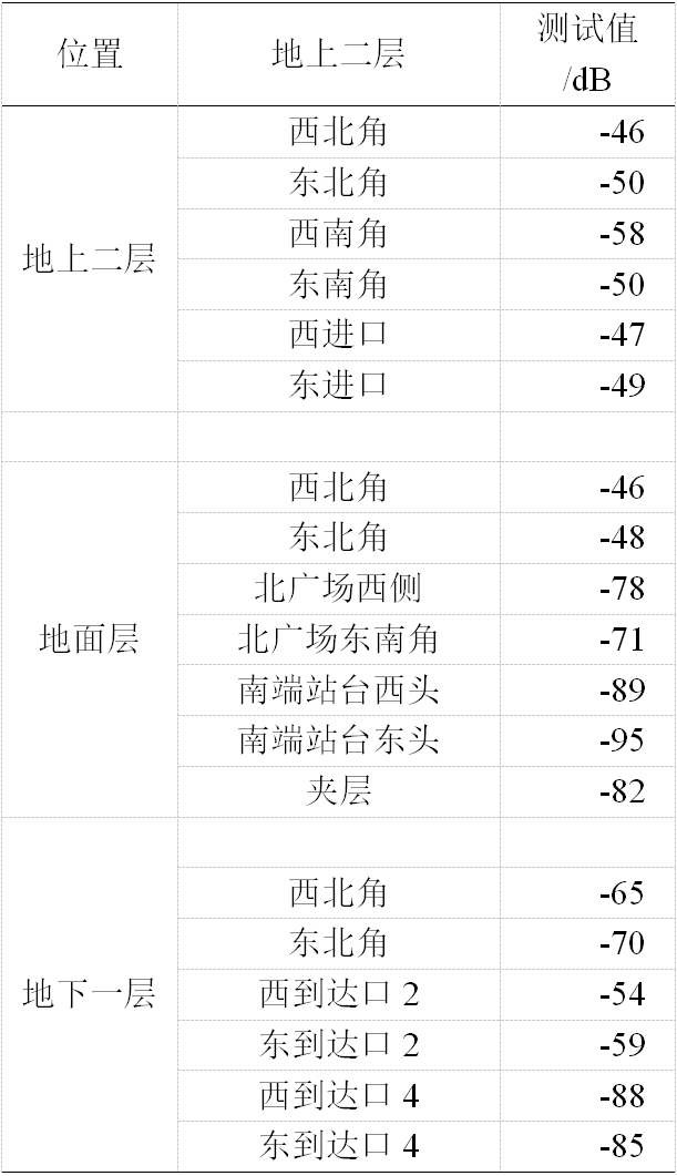首先確定系統覆蓋范圍應涵蓋整個交通樞紐,根據合肥南高鐵站建筑設計圖,了解到地上二層空間較為空曠,無線電信號傳輸過程中遮擋物較少,信號衰減程度較小;地面層空間較為空曠,信號傳輸問題不大;地下一層各個軌道間遮擋物如支柱樓梯馬道較多,信號衰減較為嚴重。架設一根天線于地上二層的中部偏北,用于二層及地面層偏北區域,又架設兩根天線于地面層和地下一層中部,信號的覆蓋可以滿足全站內的使用。實際電測數據如表1所示: