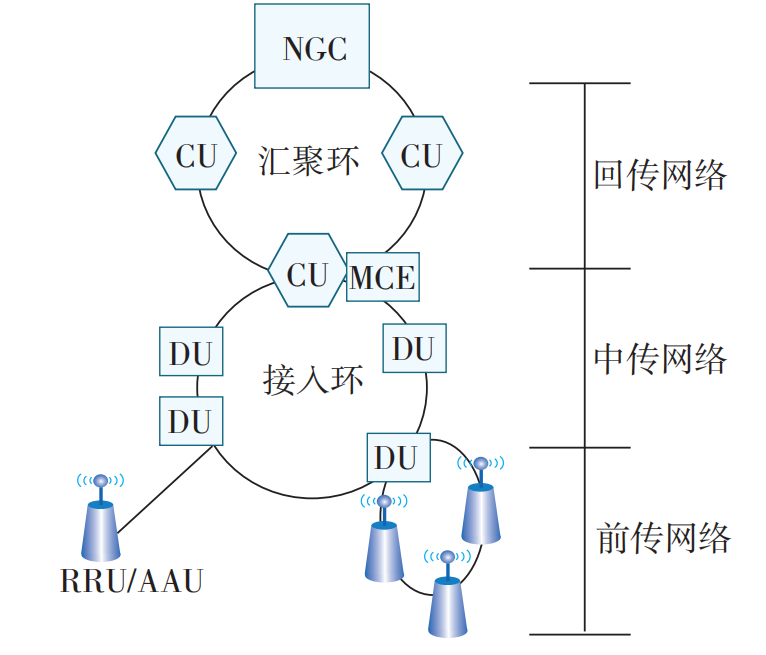 5G無線接入網(wǎng)采用CU與DU分離的C-RAN架構(gòu),CU負(fù)責(zé)處理非實(shí)時(shí)信息和3層協(xié)議棧,DU負(fù)責(zé)處理實(shí)時(shí)性要求較高的信息和底層協(xié)議棧。CU相對(duì)集中設(shè)置,多個(gè)DU可同時(shí)歸屬于1個(gè)CU,這種方式可以更有效地支持多連接以及基站間協(xié)同等技術(shù),更好地提高網(wǎng)絡(luò)吞吐量,降低干擾,提升用戶體驗(yàn)。