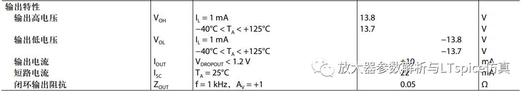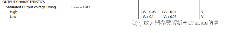 數據手冊中給出的方式有兩種,其一,直接提供高、低輸出電壓值。如圖2.3,ADA4077在±15V供電,驅動1mA負載時,低輸出電壓為-13.8V,高輸出電壓為+13.8V。