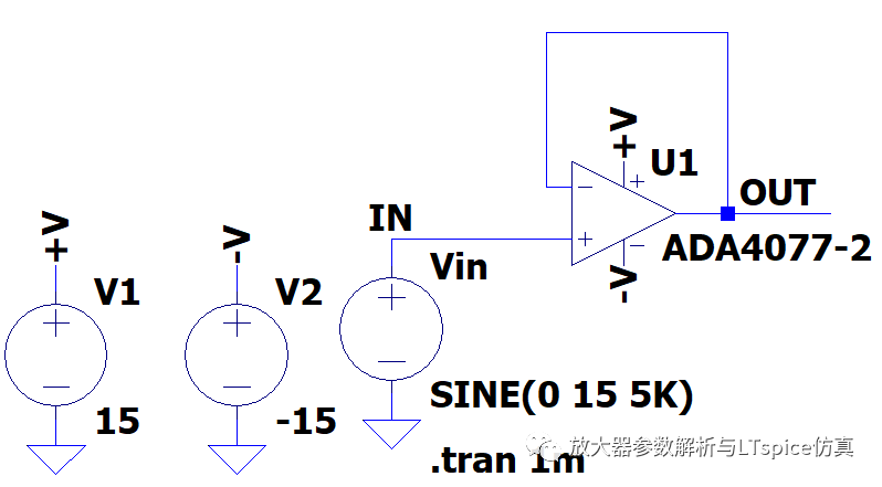 當輸入信號超出放大器的輸入電壓范圍,將發生削波現象。如圖2.169,ADA4077組建緩沖器電路,使用±15V供電,信號源Vin提供幅值為±15V,頻率為5KHz的正弦波。