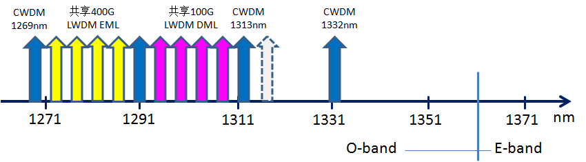 目前已在數通領域成熟使用的LWDM 8光模塊使用的波長為使用EML(電吸收調制激光器)的四個波長1274、1278、1282、1286nm與使用DML(直接調制激光器)的四個波長1295、1300、1305、1310nm;同時,目前成熟且非常便宜的CWDM在O-band的6個DML激光器的工作波長為1271、1291、1311、1331、1351、1371nm。