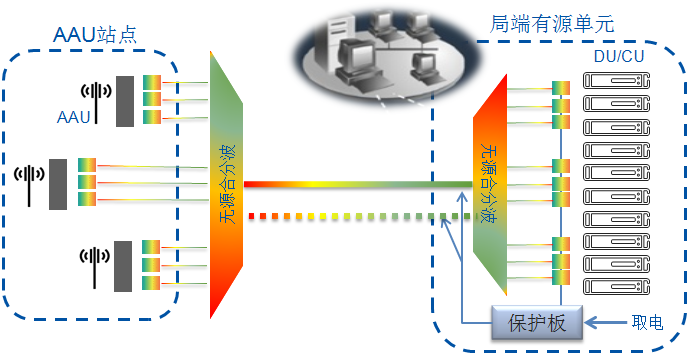 在保持端到端無源低成本的基礎上增加了有源網管及保護等輔助功能,能夠對重要的基站進行線路保護,避免因光纜線路故障造成的基站脫網,還能夠保證局端設備在掉電情況下仍不影響業務運行。