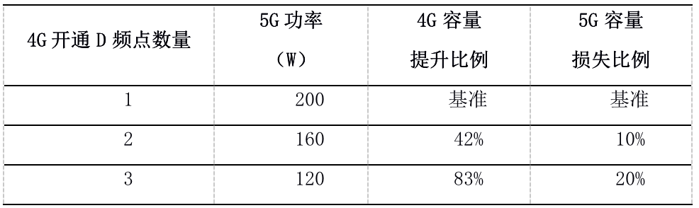 首先分析不同功率配置對容量影響:當4G新增開通2~3個D頻段載波(且通過5G反向開通4G后具備3D-MIMO能力)、同時每載波按照2W/Hz的功率譜密度進行滿功率配置,此時,5G剩余配置160W功率,5G網絡將由于功率的降低帶來約10%的容量損失,而同時4G網絡由于功率充足,可獲得高于低功率配置時42%的容量提升。不同的功率配置對容量的損失比例計算結果見表1。