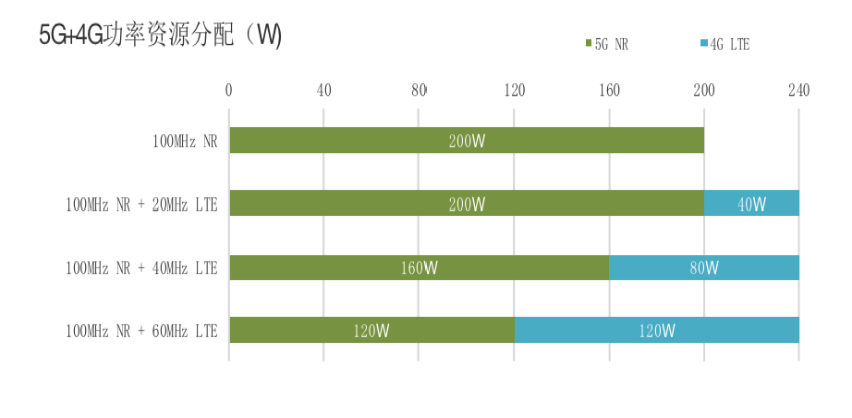 當前5G基站設備可達到240W標稱功率(遠期需求320W),考慮D頻段為5G分配100MHz帶寬、4G分配20MHz帶寬時,5G可滿足200W滿功率配置。如果4G需要更多的載波配置,則將出現功率受限的情況,此時,需考慮5G+4G功率分配以最大化網絡性能。