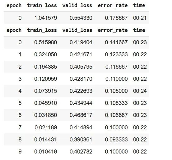 Fastai 提供了一個“fine_tune”函數,用于調整預訓練模型,以使用我們選擇的數據解決我們的特定問題。為了訓練模型,我們將 epoch 數設置為 10。