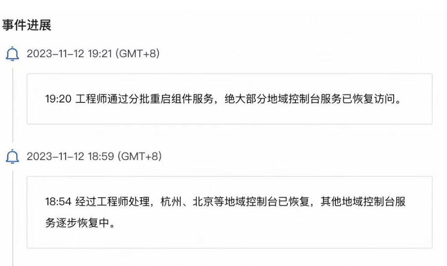 第一財經獲悉,18時54分,經過工程師處理,杭州、北京等地域控制臺已恢復,其他地域控制臺服務逐步恢復中。19時20分,工程師通過分批重啟組件服務,絕大部分地域控制臺服務已恢復訪問。