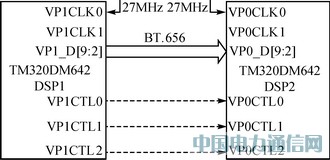 雙DSP通信模塊的設(shè)計(jì)如圖3所示。系統(tǒng)只需將DSP1的視頻口1配置成顯示模式,則VP1A將輸出符合BT.656格式的數(shù)字視頻數(shù)據(jù)流;同時(shí)將DSP2的視頻口0配置成采集模式,采集DSP1輸出的BT.656數(shù)字視頻流,然后進(jìn)行解隔行及H.264壓縮處理。由于BT.656數(shù)字視頻流內(nèi)嵌有同步信號(hào),因此VPxCTL[0:2]可接可不接。