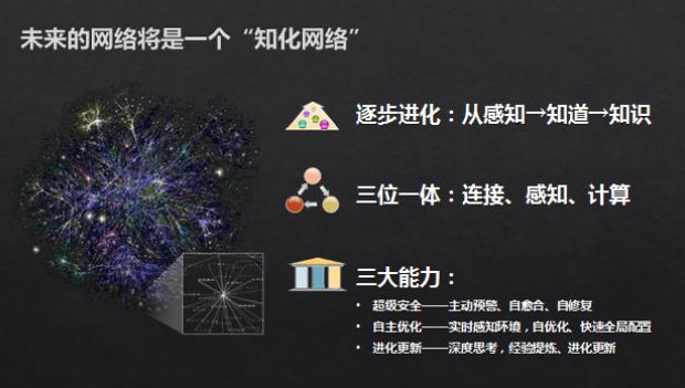 “它”將是一個“知化”網(wǎng)絡(luò),它將逐步進(jìn)化,從現(xiàn)在這種冰冷的物理連接到主動感知各類連接設(shè)備,再到分析了解網(wǎng)絡(luò)運(yùn)行的各種數(shù)據(jù),知曉如何適應(yīng)外界的變化,最后網(wǎng)絡(luò)將有智能思考的能力,形成自身的知識,會進(jìn)行策略選擇和推演,實現(xiàn)人、網(wǎng)絡(luò)和應(yīng)用的融合一體。 未來這個“知化”的網(wǎng)絡(luò)將是集連接、感知、計算和數(shù)據(jù)服務(wù)為一體的網(wǎng)絡(luò),將會實現(xiàn)超級安全、自主優(yōu)化、進(jìn)化更新等三大能力。